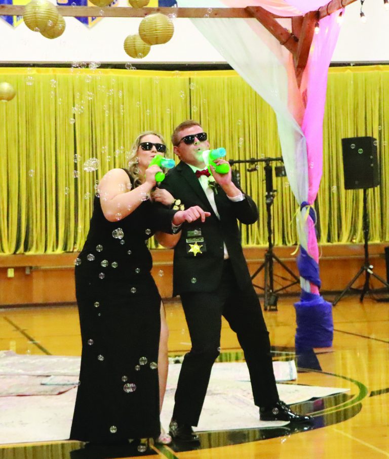 The 2023 Syracuse Prom took place on Saturday, April 1, at the high school gym with the theme being Arabian Nights. Students participated in a grand march and crowned prom royalty before dancing the night away. Pictured, Jackson Nordhues and Sydney Parsons, flash a badge and fire their bubble guns in a display of grand march fun and frivolity.