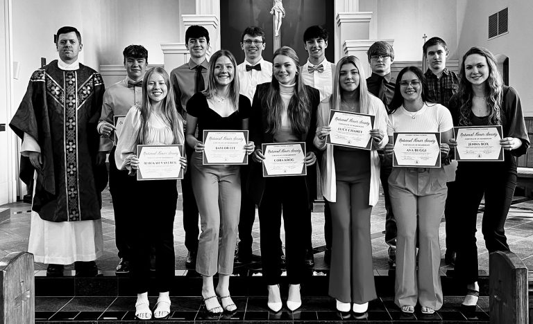 Lourdes Central Catholic recently inducted 12 new members from the junior class to the National Honor Society. Front row, from left are Rebekah Vaverek, Baylor Lee, Cora Krog, Lucy Chaney, Ava Buggi, Jenna Box; second row: Fr. Jonathan Haschke, CAO, Alex Peter, Jayger Haag, Ben Chance, Nolan Beccard, Isaac Bruggeman, and Jake Bebout.