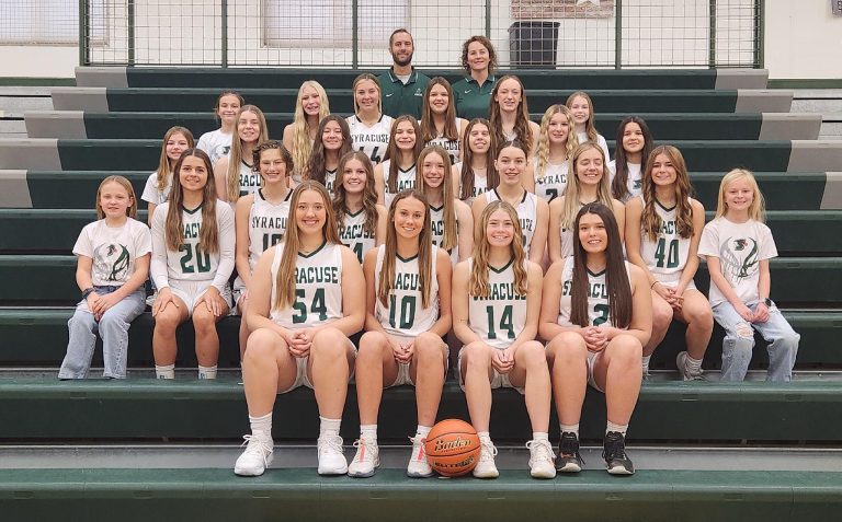Syracuse-Dunbar-Avoca Girls BasketballFront row from left are Hailey Kirchhoff, Kadyn Sisco, Eva Brammier, Abby Geiser; second row: Reese Tuxhorn, Bridget Donovan, Haleigh Werner, Aselen Farley, Jayden Meyer, Trinity Geiser, Claire Noerrlinger, Kathleen Donovan, Harper Janssen; third row: Lucy Lessmann, Sidney Schubarth, Kaita Kreifels, Ashlynn Vestal, Mayson Sprague, Zoey Sieck, Mya Campbell; fourth row: Oakley Janssen, Brylar Werner, Izabel Stubbendick, Teagan Starzec, Aubree Tuxhorn, Landry Hestermann; fifth row: Coach Andrew Pryor and Coach Dana Stark. Photo by Lynn Wilhelm
